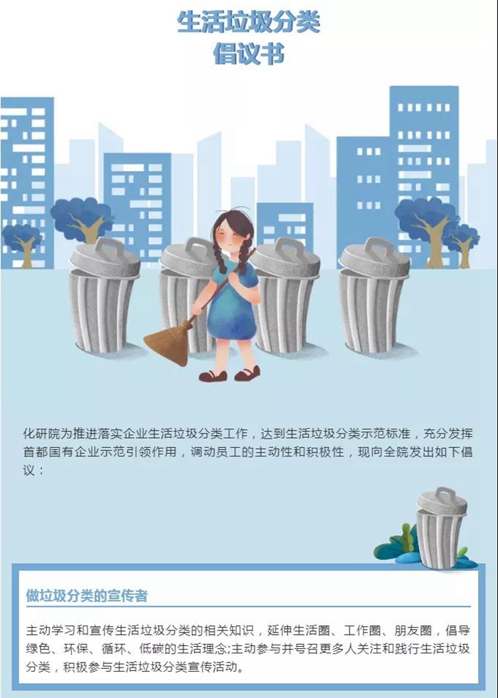 化研院為充分發(fā)揮首都國(guó)有企業(yè)在“推進(jìn)落實(shí)企業(yè)生活垃圾分類工作,達(dá)到生活垃圾分類示范標(biāo)準(zhǔn)”工作中示范引領(lǐng)作用,向全院干部職工發(fā)出了做好垃圾分類的倡議書(shū)。