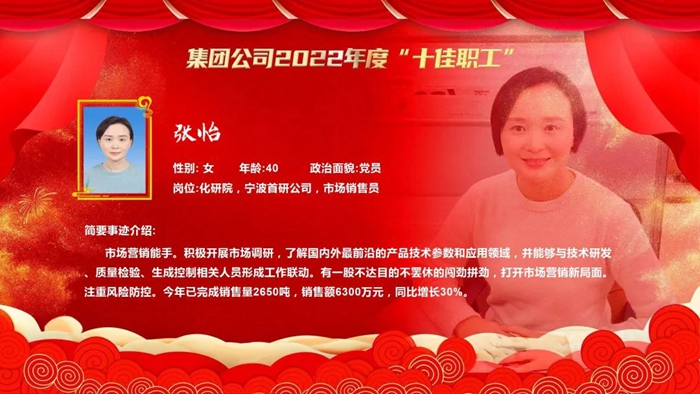 為激勵苦干實干、樹立身邊典型、打造先進(jìn)品牌,不斷強(qiáng)化廣大職工“企業(yè)發(fā)展、我有責(zé)任,拼搏‘3+1’、我在行動”主人翁意識,促進(jìn)企業(yè)高質(zhì)量發(fā)展,經(jīng)企業(yè)推薦、廣泛遴選、優(yōu)中選優(yōu)、民主集中、會議研究,北京化工集團(tuán)決定,授予北京市化學(xué)工業(yè)研究院有限責(zé)任公司寧波首研公司市場銷售員張怡(女)等10名同志北京化工集團(tuán)2022年度“十佳職工”,并在北京化工集團(tuán)二屆一次職代會暨2023年度工作會上予以表彰。