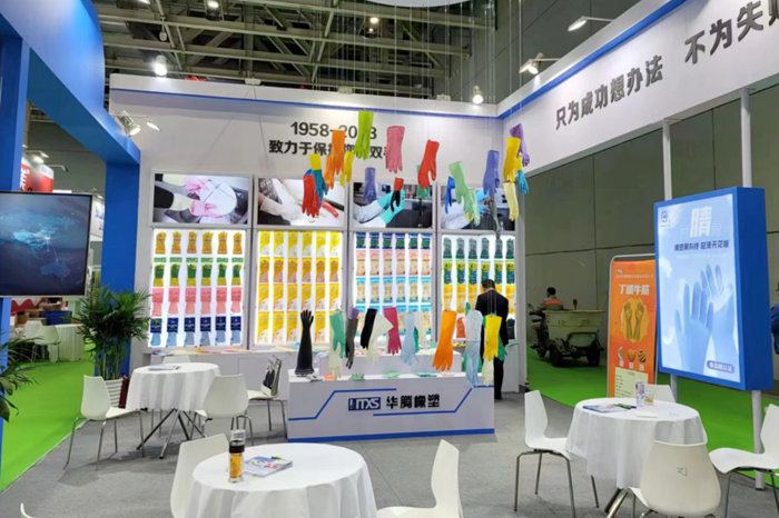 新的LOGO不僅展示著企業(yè)新形象,更昭示著華騰橡塑融入國內(nèi)大循環(huán)、國內(nèi)國際雙循環(huán)的雄心。10月15日,華騰橡塑銷售團隊專程來到廣州,參加第134屆中國進出口商品交易會(廣交會),在“工具展區(qū)”和“新材料及化工產(chǎn)品展區(qū)”架設(shè)兩大展位,全面推銷橡塑乳膠手套產(chǎn)品和膠板產(chǎn)品。在手套產(chǎn)品展位,展示了公司的家用手套和工業(yè)用手套。多種材質(zhì)、用途可以充分滿足客戶的不同需求。公司自主研發(fā)的絕緣手套和干箱手套備受觀眾關(guān)注;在膠板產(chǎn)品展位,展示了工業(yè)、牧場、運動等系列膠板產(chǎn)品,花型種類豐富,可滿足多種場合的應(yīng)用需求。