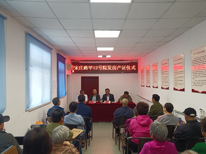 4月25日上午,東鐵匠營街道第二社區(qū)會議室門前被一團喜慶氣氛所環(huán)繞。宋莊路甲12號院的54戶住戶接過期盼已久的房產(chǎn)證,每個人的臉上都洋溢著幸福的喜悅。此時,化工廠“宋莊路甲12號院發(fā)放房產(chǎn)證儀式”正在這里舉行。