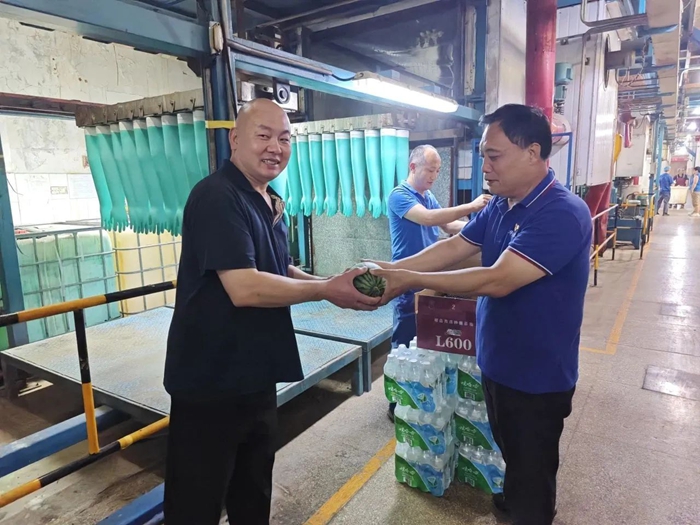 就在“職工之家”開放之際,一份清涼也送到了職工手中。近日,華騰橡塑領導專程來到瑞京公司生產(chǎn)一線,向在酷暑中仍然奮戰(zhàn)在一線的干部職工送上清涼飲品和爽口西瓜,并對大家表示慰問,叮囑大家要做好防暑降溫工作。