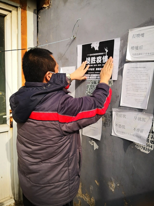 為了將社區(qū)防控真正落實落細(xì),化實廠黨總支經(jīng)過研究,迅速成立以總務(wù)部為核心的疫情防控小分隊。準(zhǔn)確掌握住戶的信息是防控的關(guān)鍵,化實廠總務(wù)部3位同志放棄休息,全員到崗,與街道、社區(qū)的工作人員一起入戶,逐戶排查、登記、宣傳防控要點、在院內(nèi)張貼宣傳材料,確保宣傳到戶、宣傳到人。