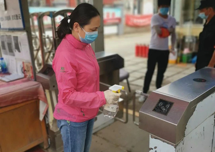 集團(tuán)總部 時建秀 在工作區(qū)域噴灑酒精進(jìn)行崗前消毒