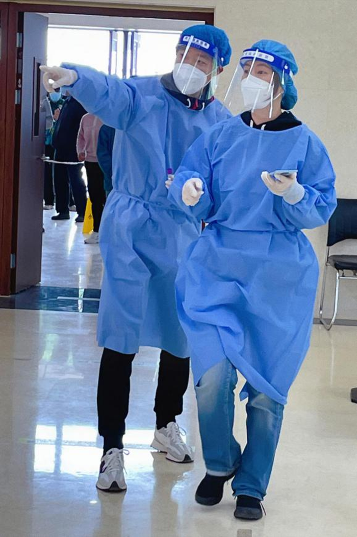 我所下沉的社區(qū)居民將近2600人,一般情況下排隊20到30米,人多的時候隊伍能有100多米長。社區(qū)分為兩道核酸通道,一天一條通道能掃描1200至1300人左右。由于戴著防護面罩與口罩,說話聲音并不是很清晰,為此我只能不停地重復著相同的提示,一天下來不僅嗓子沙啞了,汗水也浸透了全身。