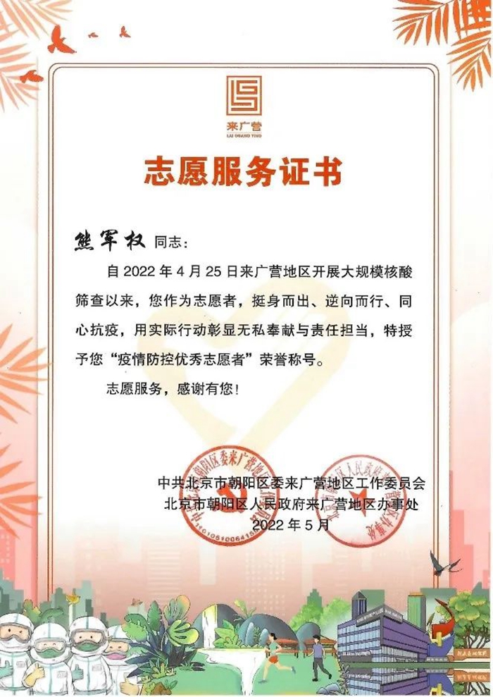 我真心地感謝北京化工集團(tuán)、華騰東光公司領(lǐng)導(dǎo)給予了我這樣一次難得的、意義深遠(yuǎn)的志愿服務(wù)機(jī)會,公司黨總支、工會還給我送來了慰問和溫暖。如果再有這樣的機(jī)會,我依然會積極去服務(wù),盡自己的努力為身邊的人做一些力所能及的事。我志愿,我快樂,請組織放心,請領(lǐng)導(dǎo)放心,為了北京的平安,為了社區(qū)的平安,作為國企職工,我一定堅持到底,戰(zhàn)斗到底,直到北京全面清零,共創(chuàng)我們的美好家園。