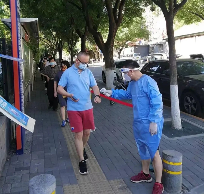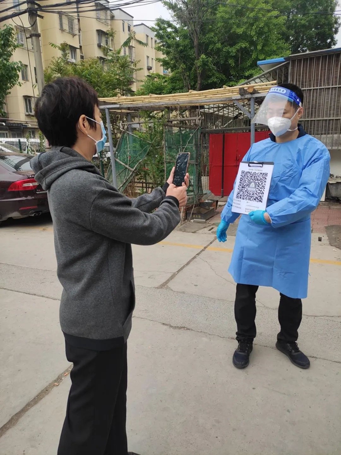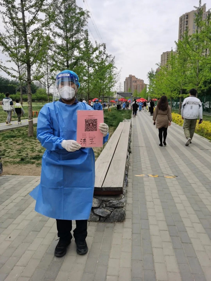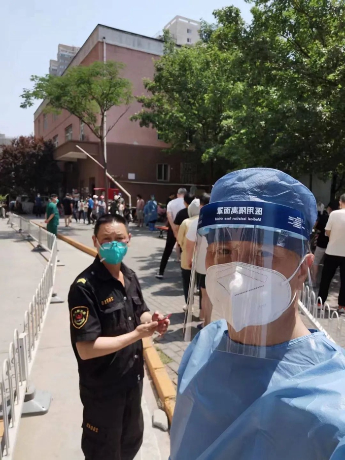 5月的天氣,溫度說升就升,每天2次4個小時的防護(hù)服穿下來,下崗時每每全身濕透,但我一點也不后悔,看著手機(jī)里每次錄入600人、700人、800人等的信息時,內(nèi)心升起一種無比的自豪,北京全員核酸檢測里有我的一份汗水。