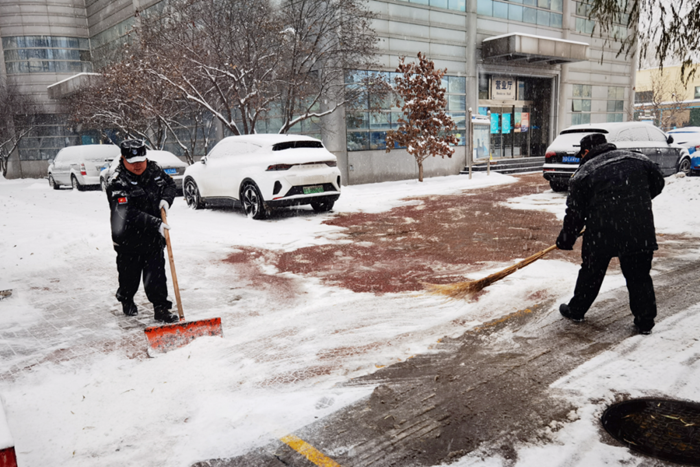 大雪壓城,華騰拓展公司迅速響應(yīng),每天派出50余名職工進行掃雪鏟冰行動。為了確保在寫字樓中辦公的客戶出行和業(yè)務(wù)不受影響,華騰拓展職工冒雪開展掃雪鏟冰工作,并對主要路段使用融雪劑進行融雪作業(yè),防止結(jié)冰打滑產(chǎn)生安全事故。