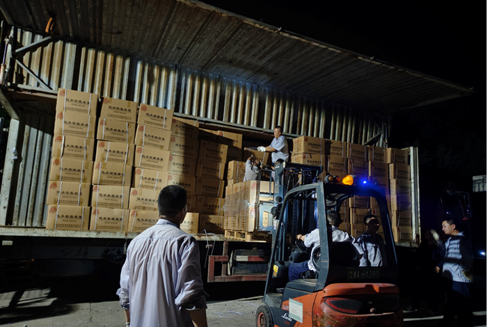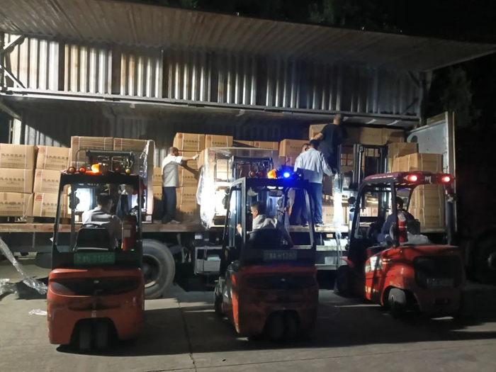 剛剛出庫(kù)完畢,還沒等干部職工歇歇腳,17時(shí)左右,市應(yīng)急局再次發(fā)來(lái)指令,追加雨衣3700套,華騰化工迅速調(diào)度第5輛專用車輛進(jìn)行物資裝車,干部職工也馬不停蹄地投入到裝載工作中。正在酣戰(zhàn)之時(shí),18時(shí)許,市應(yīng)急局第三道指令接踵而至,追加18000條編織袋和32000條吸水膨脹麻袋。華騰化工再次緊急調(diào)度第6、7輛專用車輛,現(xiàn)場(chǎng)干部職工發(fā)揚(yáng)連續(xù)作戰(zhàn)精神,在3小時(shí)內(nèi)完成全部應(yīng)急物資的裝車、發(fā)貨任務(wù)。