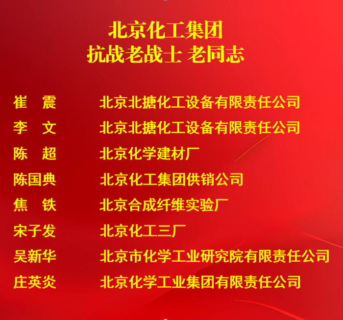 在紀念中國人民抗日戰(zhàn)爭暨世界反法西斯戰(zhàn)爭勝利 80 周年之際,黨中央、國務院、中央軍委為健在的抗戰(zhàn)老戰(zhàn)士、老同志授予“中國人民抗日戰(zhàn)爭勝利 80 周年紀念章”,北京化工集團8位抗戰(zhàn)老戰(zhàn)士、老同志榮獲紀念章。