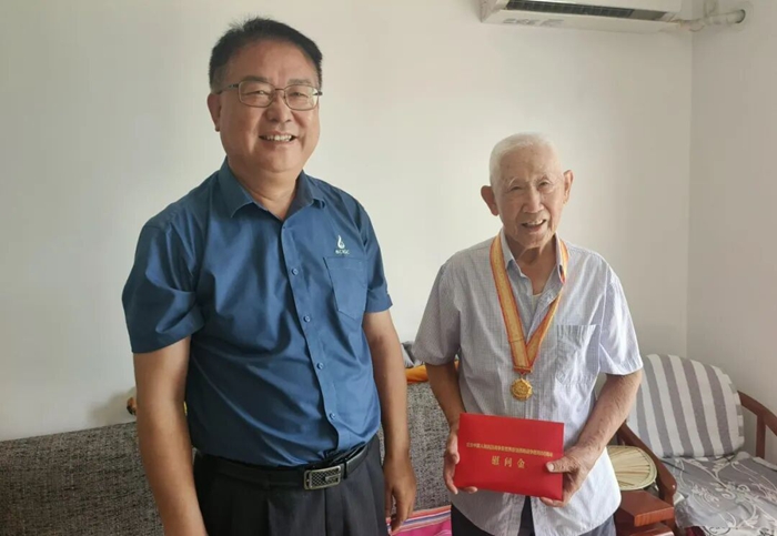 北京化工集團黨委高度重視紀念章頒發(fā)工作,黨委書記、董事長陳宇等集團領導帶隊向抗戰(zhàn)老戰(zhàn)士、老同志吳新華、焦鐵、崔震頒發(fā)紀念章,向老戰(zhàn)士、老同志們致以崇高敬意、親切慰問。