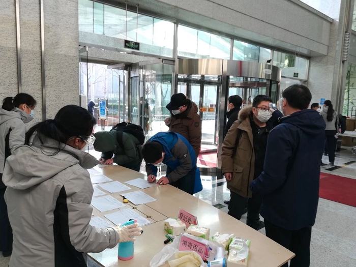 早上8:10,各崗位人員按照前一天下午預(yù)案推演的分工,各就各位,各司其職,等待著入樓辦公人員高峰的到來(lái)。大廈員工身著工裝,佩戴手套、口罩和護(hù)目鏡,分列于兩個(gè)側(cè)門(mén)入口,有的做好入門(mén)信息登記,有的手持測(cè)溫儀挨個(gè)測(cè)體溫,有的在門(mén)口引導(dǎo)人員分高層和底層兩個(gè)口入樓。