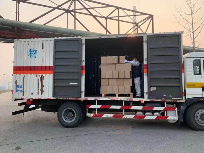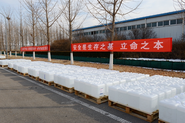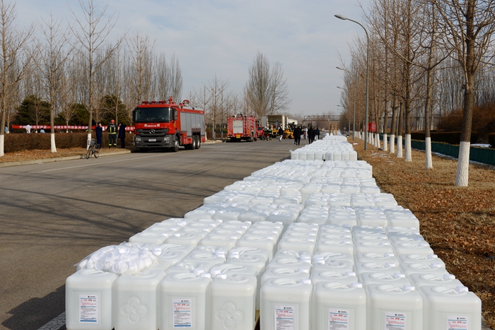 根據(jù)用戶反饋的需求信息,經(jīng)市物資保障組決定,將25L大包裝調(diào)整為500ML/瓶小包裝,北化集團(tuán)承擔(dān)相關(guān)卸貨、進(jìn)庫、儲存、配送任務(wù)。由華騰化工公司倉儲事業(yè)部、安全生產(chǎn)部、保衛(wèi)部、公用工程事業(yè)部20名同志負(fù)責(zé)卸貨入庫。