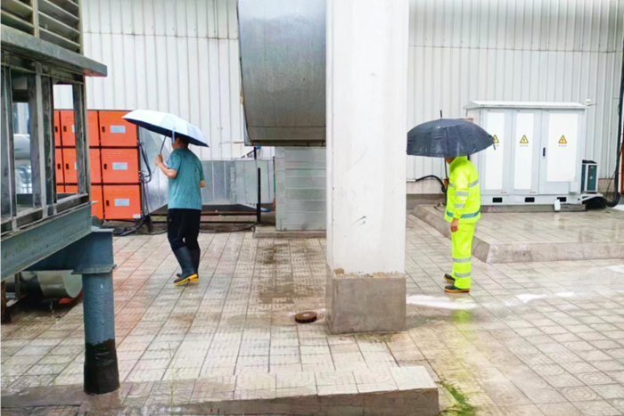 7月30日,屬地普降大雨,廠區(qū)出現(xiàn)大量積水,為防止再次降雨造成水位升高,雨水進(jìn)入庫房等重點(diǎn)區(qū)域,公司領(lǐng)導(dǎo)帶領(lǐng)安全干部隊(duì)伍趕赴一線,親力親為,對廠區(qū)排水口、井箅子等積存污泥進(jìn)行及時(shí)清除,加裝水泵以加快廠區(qū)雨水排放,做到雨停路凈。