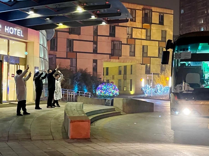 2月12日大年初一夜里,正當人們闔家團聚喜迎新春之時,華騰美居酒店干部員工卻以“歡送”的方式迎接這一喜慶時刻的到來。此時的華騰美居酒店大堂門前,北化房地產(chǎn)公司黨總支委員、副總經(jīng)理、美居酒店負責人白江正與酒店管理人員一起守候在門口,向魚貫而出的人們揮手告別,目送他們踏上回家的大巴車。同樣的一幕在次日的大年初二夜里再次上演。至此,262名隔離人員在華騰美居酒店完成21天隔離觀察,并經(jīng)核酸檢測為陰性后,于2月12、13日大年初一和初二夜里,分兩批全部踏上了返家的路途。