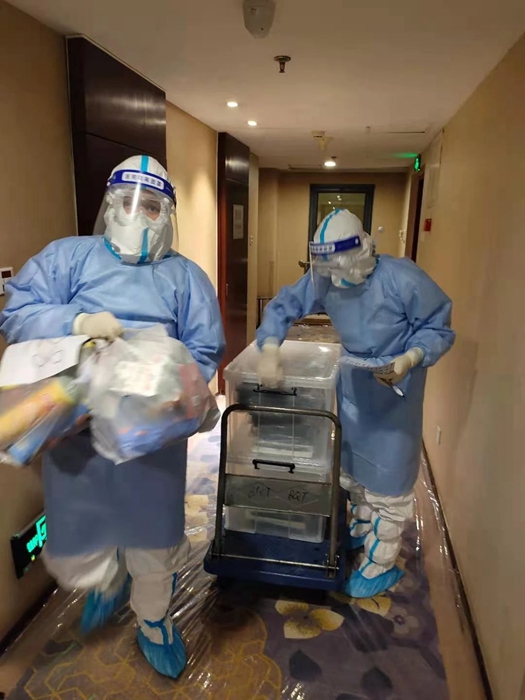 穿戴嚴密防護服的他們,每天都要在嚴格消殺的基礎(chǔ)上,完成早中晚三輪的餐食配送,然后再完成三輪的物資配送。此外,每天深夜時分,他們還要在嚴格消殺后,完成隔離區(qū)垃圾收納工作。262人分布在不同樓層,每人都要配送到位,收納到位,每一輪工作結(jié)束后,他們都已經(jīng)累得氣喘吁吁、渾身濕透……