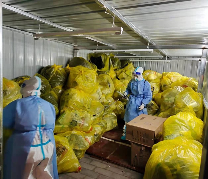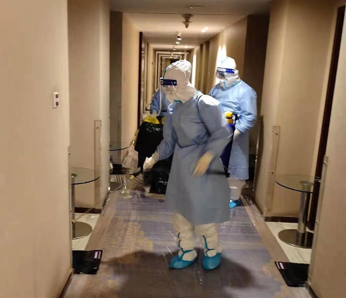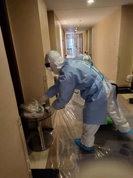 從收到通知到隔離人員全部返家的23天里,共產(chǎn)黨員、酒店負責人白江一直在酒店 “坐陣指揮”,最快速解決面臨的各種問題。7名隔離區(qū)消殺組成員每日24時至凌晨3時進行垃圾收撿,每日晚餐后還要對公共區(qū)域進行全方位消殺,對每天產(chǎn)生的800多公斤醫(yī)療垃圾廢物,收撿后運輸?shù)綄S美娣盘?,進行全方位消殺。