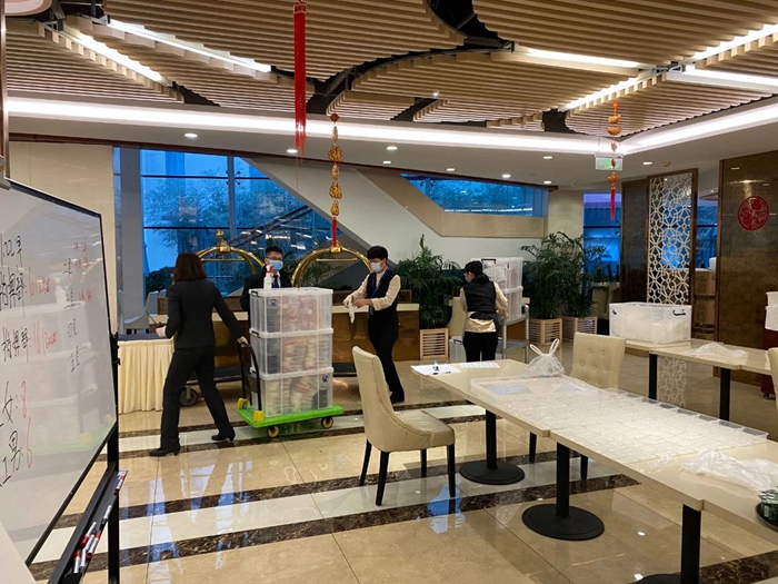 一場按照隔離服務(wù)標準進行酒店改造的大會戰(zhàn)隨即打響。從酒店區(qū)域劃分到人員分配培訓(xùn),從制定用餐標準到采購所需物資,從接待程序到后勤保障……在領(lǐng)導(dǎo)小組的直接指揮下,每一項工作逐一明確責任,每一項細分事項逐一落實到人、到物……一場涉及全酒店的系統(tǒng)改造工程就在這緊張忙碌,卻不失有序的氛圍中全面鋪開,從艷陽高照到日薄西山,從華燈初上到到夜深人靜……酒店全體員工通宵投入到改造中,華騰美居酒店迎來了一個不眠之夜。