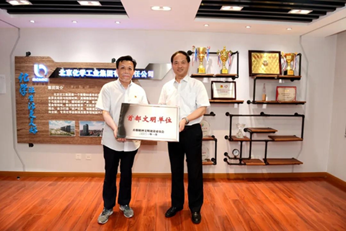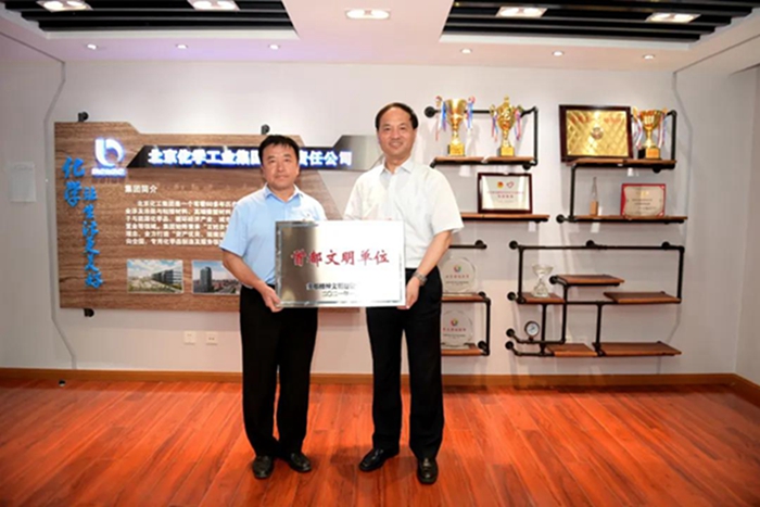 9月1日,北京化工集團(tuán)黨委書記、董事長王國華向獲首都文明單位稱號的3個(gè)單位授牌,黨委副書記吳瑞峰,總經(jīng)理助理、華騰拓展公司黨總支書記李泳,化研院黨總支書記楊傳忠,華騰天海公司黨總支書記崔志宏參加授牌儀式。