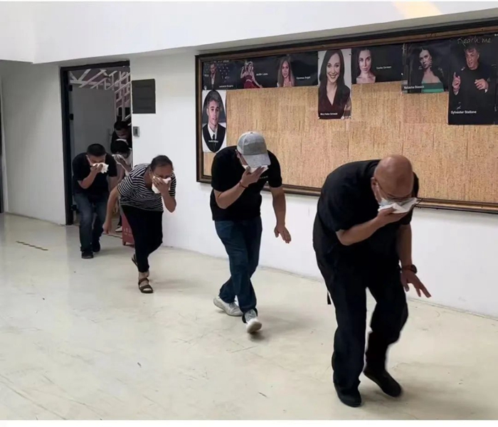 突然出現(xiàn)的“火情”讓辦公大樓“濃煙滾滾”,隨著警報(bào)的響起,只見(jiàn)辦公人員用濕毛巾捂住口鼻,放低身位,沿著消防通道指示標(biāo)志魚貫撤出辦公大樓……