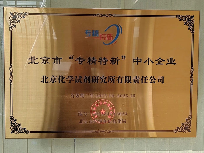 2021年至2024年,試劑所共取得發(fā)明專利授權(quán)7項,實用新型專利11項,其中2024年新授權(quán)發(fā)明專利2項,另有3項發(fā)明專利正在評審中。2022年10月,是值得試劑所干部職工銘記的一個金秋。在這天朗氣清的十月,試劑所被北京市經(jīng)濟和信息化局授予“專精特新”中小企業(yè)。這一有著強烈時代特色,代表著新質(zhì)生產(chǎn)力發(fā)展方向的資質(zhì),是對這家有著60余年發(fā)展歷史的科研型企業(yè),以科技為引領(lǐng),深耕試劑產(chǎn)業(yè)鏈的最大肯定和褒獎。